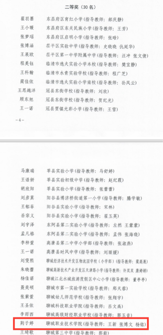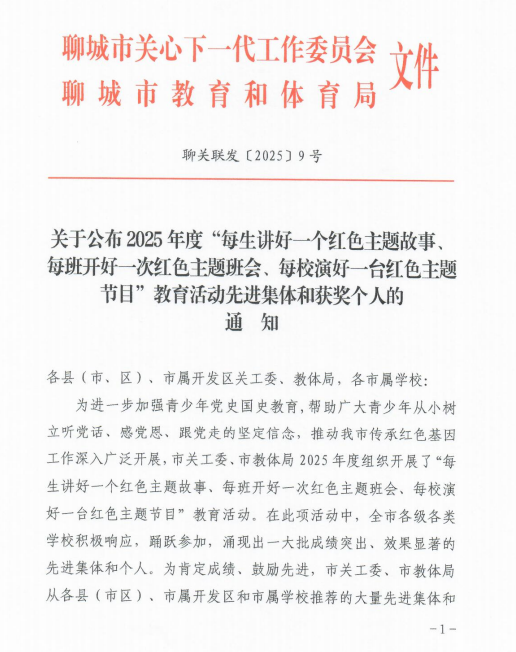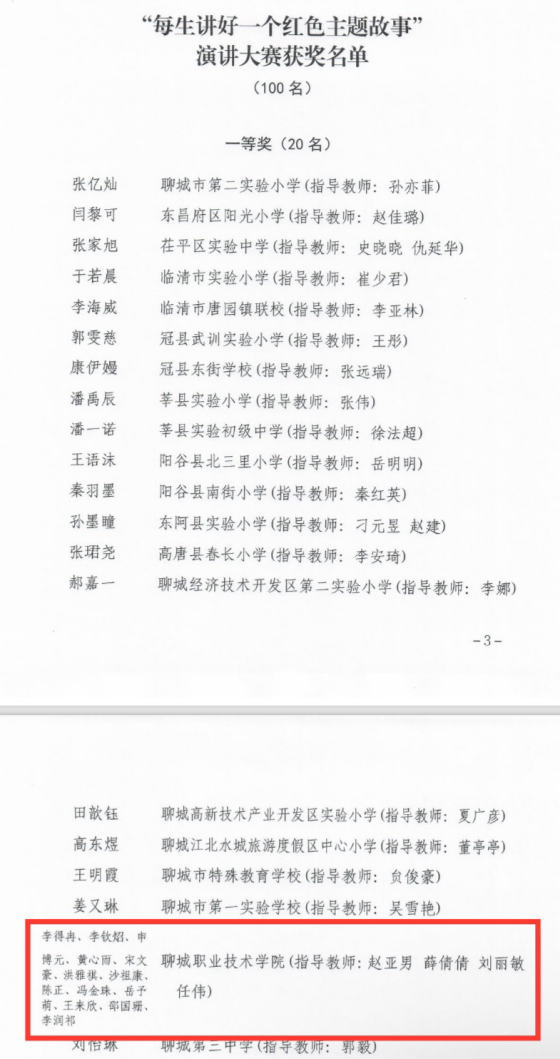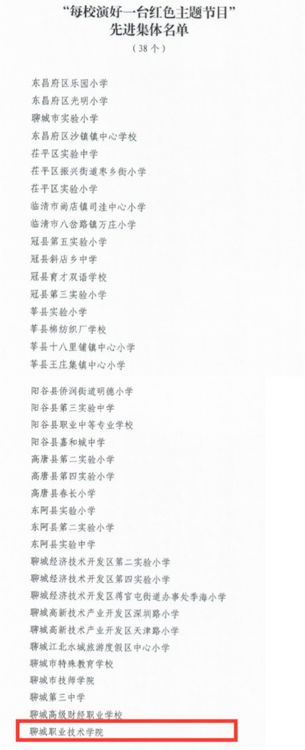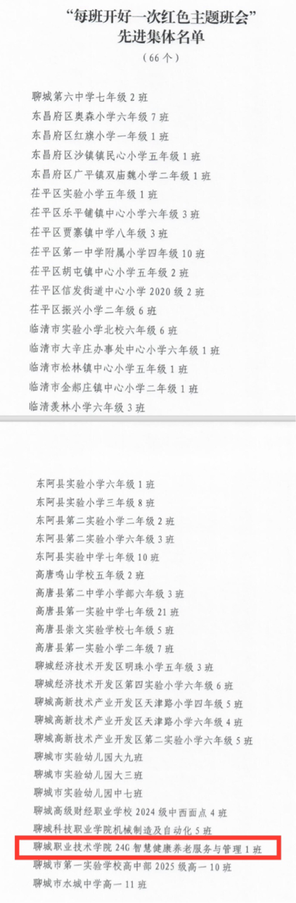 近日,聊城市关心下一代工作委员会、聊城市教育和体育局公布2025年度“每生讲好一个红色故事、每班开好一次红色主题班会、每校演好一台红色主题节目”教育活动先进集体和获奖个人,聊城职业技术学院荣获“每校演好一台红色主题节目”先进集体称号,智能制造学院李得冉等13名同学获“每生讲好一个红色主题故事”演讲大赛一等奖,医药学院荆子婷同学获“每生讲好一个红色主题故事”演讲大赛二等奖,健康护理学院24G智慧健康养老服务与管理1班获“每班开好一次红色主题班会”先进集体称号。