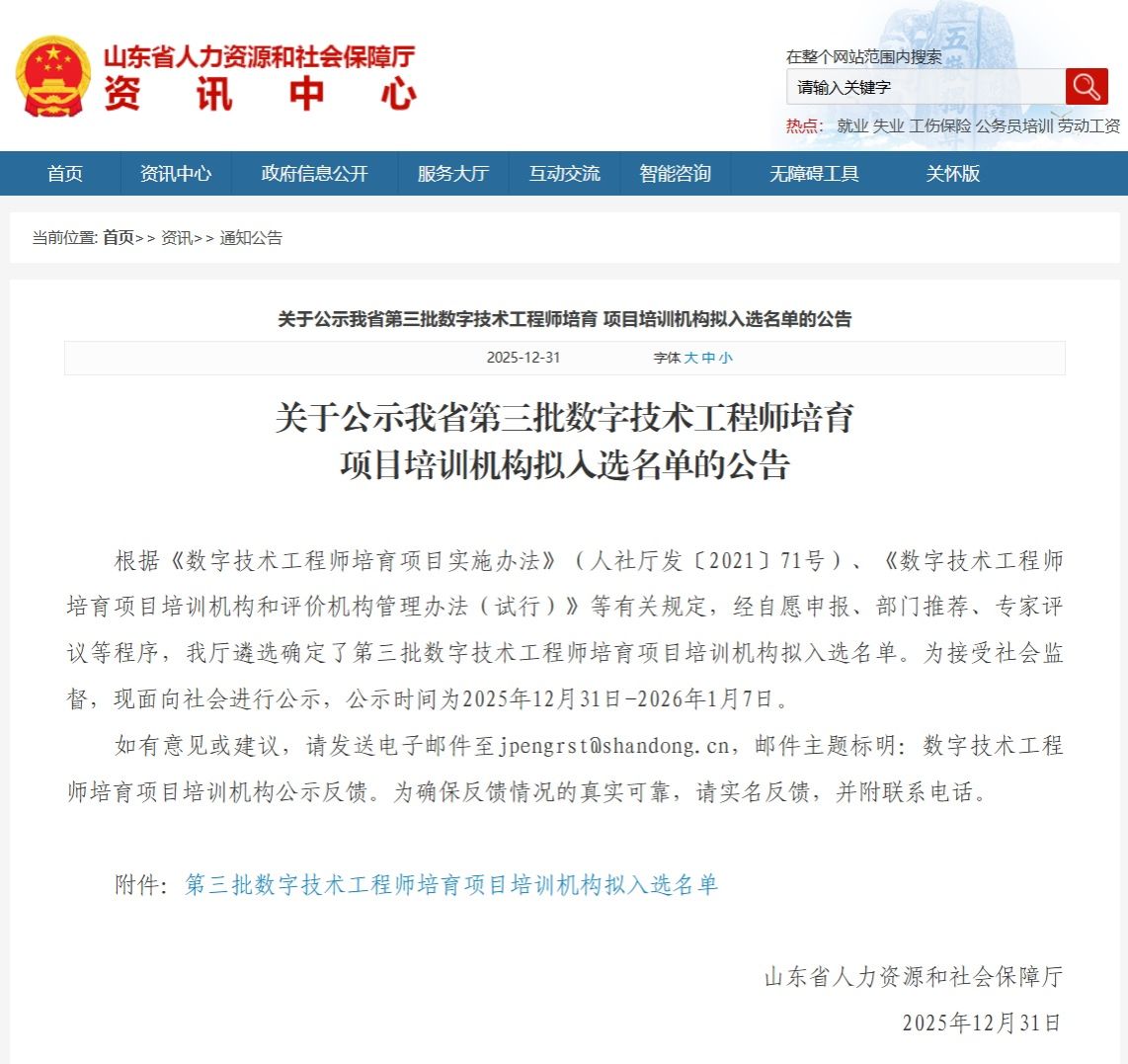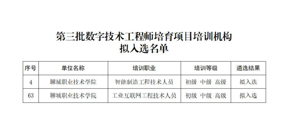 近日,山东省人力资源和社会保障厅公示我省第三批数字技术工程师培育项目培训机构拟入选名单,聊城职业技术学院成功入选,将承担“智能制造工程技术人员”“工业互联网工程技术人员”的培育培训工作。
