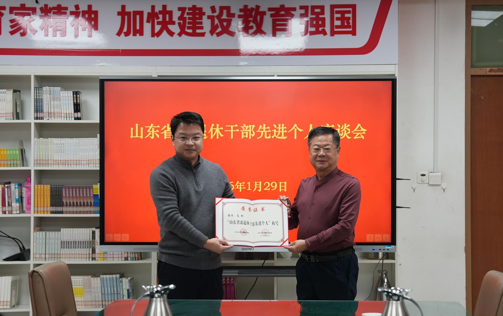 1月29日,聊城职业技术学院召开山东省离退休干部先进个人座谈会,对学校原党委委员、副院长高杉获得“山东省离退休干部先进个人”表彰奖励给予祝贺。市委老干部局副局长耿一凡出席,并为高杉颁发荣誉证书。学校党委副书记刘雪巍,党委委员、组织部部长孙华祥出席。