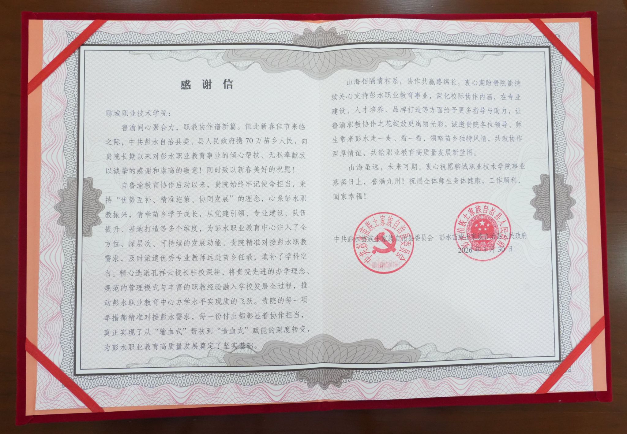 柳振方在讲话中指出,聊城彭水两地自2011年建立协作关系以来,始终以高度的政治责任感,高标准推进协作任务落地落实,各项工作取得扎实成效。聊城始终急彭水所需、尽自身所能,真抓实干地开展帮扶。2025年,聊城派出数十名干部对彭水进行支农、支教、支医,其中就有3名聊城职业技术学院的干部及专业教师,他对此表示衷心感谢。他希望聊城职业技术学院一如既往地支持鲁渝协作,做好支援彭水干部教师的坚强后盾。他代表彭水苗族土家族自治县委、县政府向聊城职业技术学院赠送了感谢信。