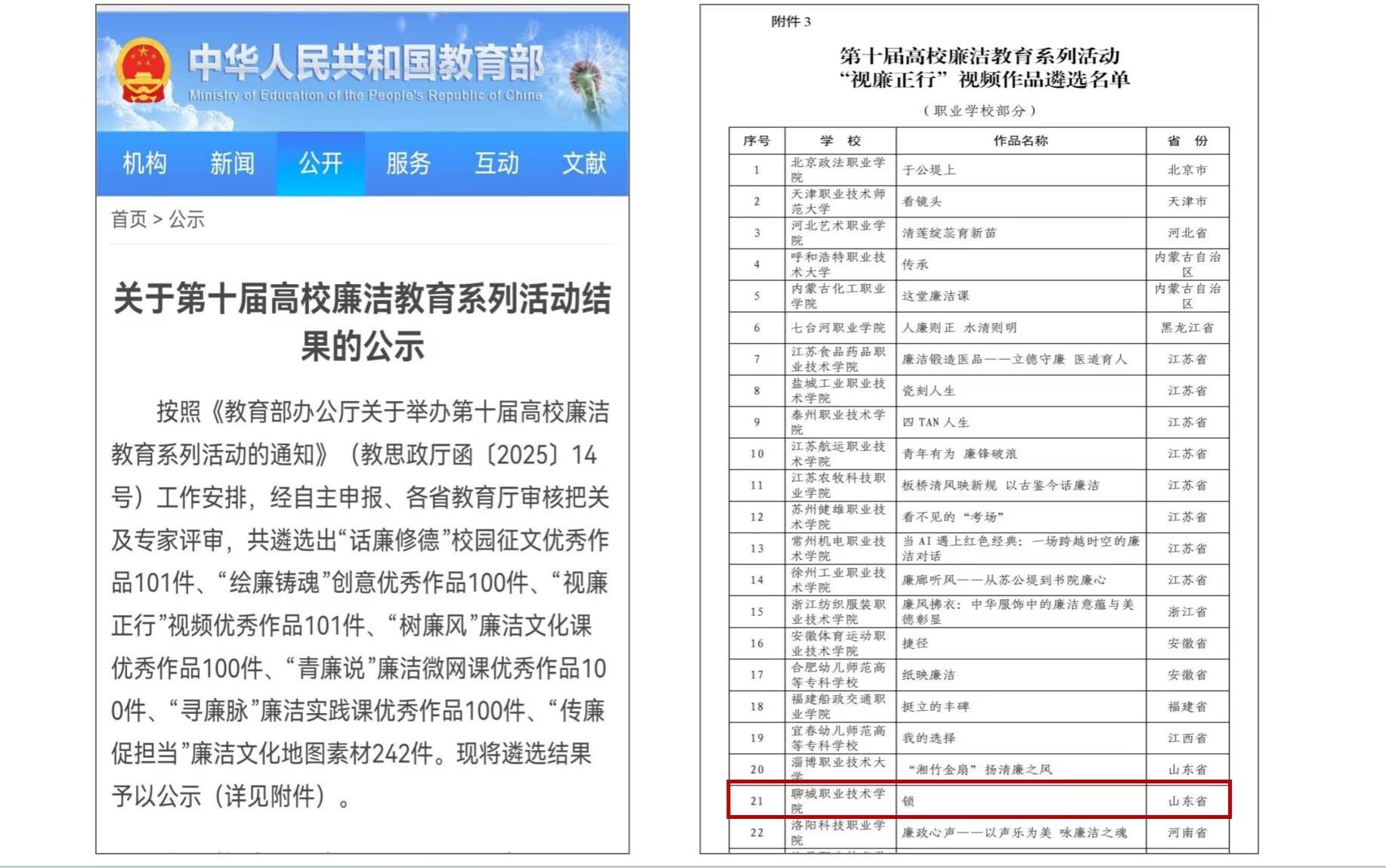 近日,教育部公布第十届高校廉洁教育系列活动评选结果,聊城职业技术学院纪委与马克思主义学院精心创作的《锁》在“视廉正行”视频作品申报类中脱颖而出,斩获佳绩,展现了学校在廉洁文化教育与思政育人融合发展中的扎实成效。