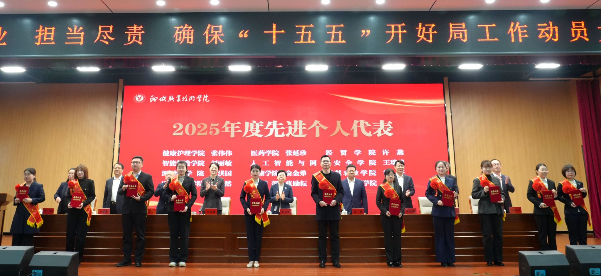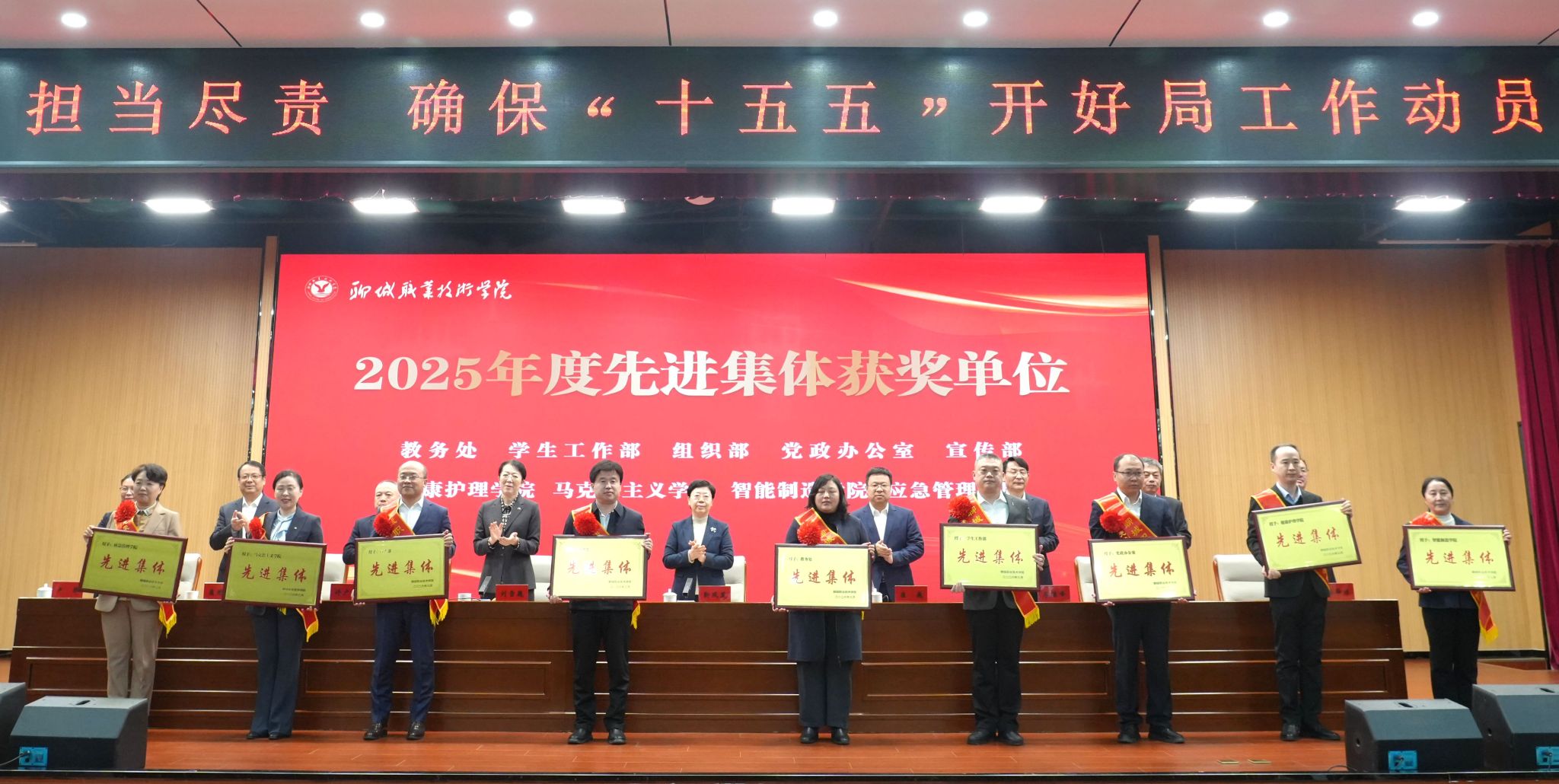 党委副书记刘雪巍传达了山东省、聊城市干事创业担当尽责确保“十五五”开好局工作会议精神,宣读了《中共聊城职业技术学院委员会关于表扬2025年度先进集体、先进个人的通知》。大会还对教务处等9个先进集体,获得特色创新奖的医药学院和先进个人代表进行了颁奖。教务处、质量管理处、学生工作部、马克思主义学院、人工智能与网络安全学院、应急管理学院负责同志作了典型发言。