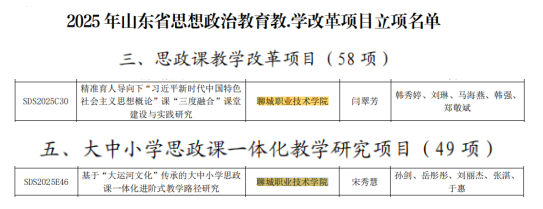 近日,山东省教育厅公示2025年度思想政治教育教学改革项目立项评审结果,聊城职业技术学院共有2项课题成功入选,立项类别覆盖“思政课教学改革项目”与“大中小学思政课一体化教学研究”2个重点方向。