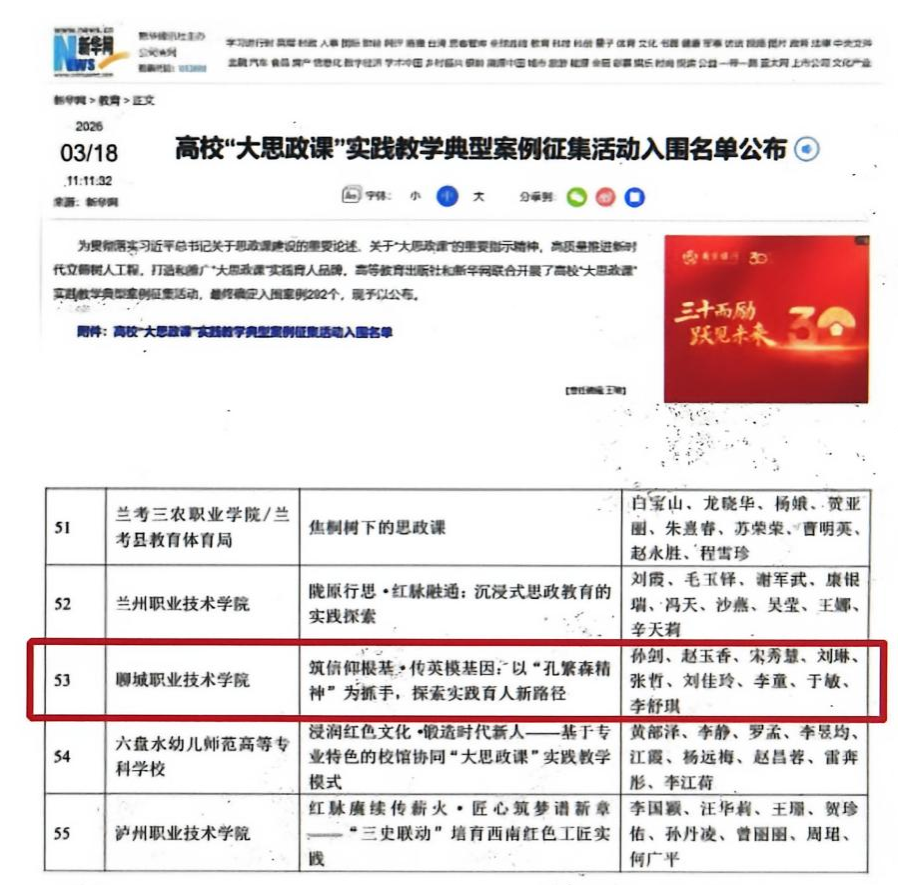 近日,由高等教育出版社、新华网联合开展的高校“大思政课”实践教学典型案例征集活动结果公布,聊城职业技术学院报送的《筑信仰根基•传英模基因:以“孔繁森精神”为抓手,探索实践育人新路径》入选。