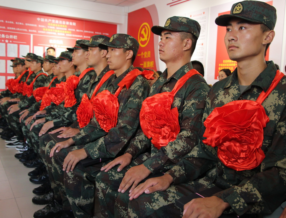 徐龙海、丁秀峰共同为53名新入伍大学生佩戴荣誉红花。