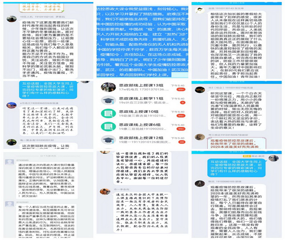 思政部负责人孙剑表示:“思政大课”,为全国高校思想政治理论课教师上了一堂精彩纷呈的示范课,我们将以其为范、学其所长,不断改革创新思政课教学内容和方法,使特殊疫情形势下的停课不停教、停课不停学,落到实处,确有成效,始终发挥好在“立德树人”中的关键作用,引领大学生正确认识世界与中国、历史与现实、危机与优势,不负使命、担当责任、奉献青春。
