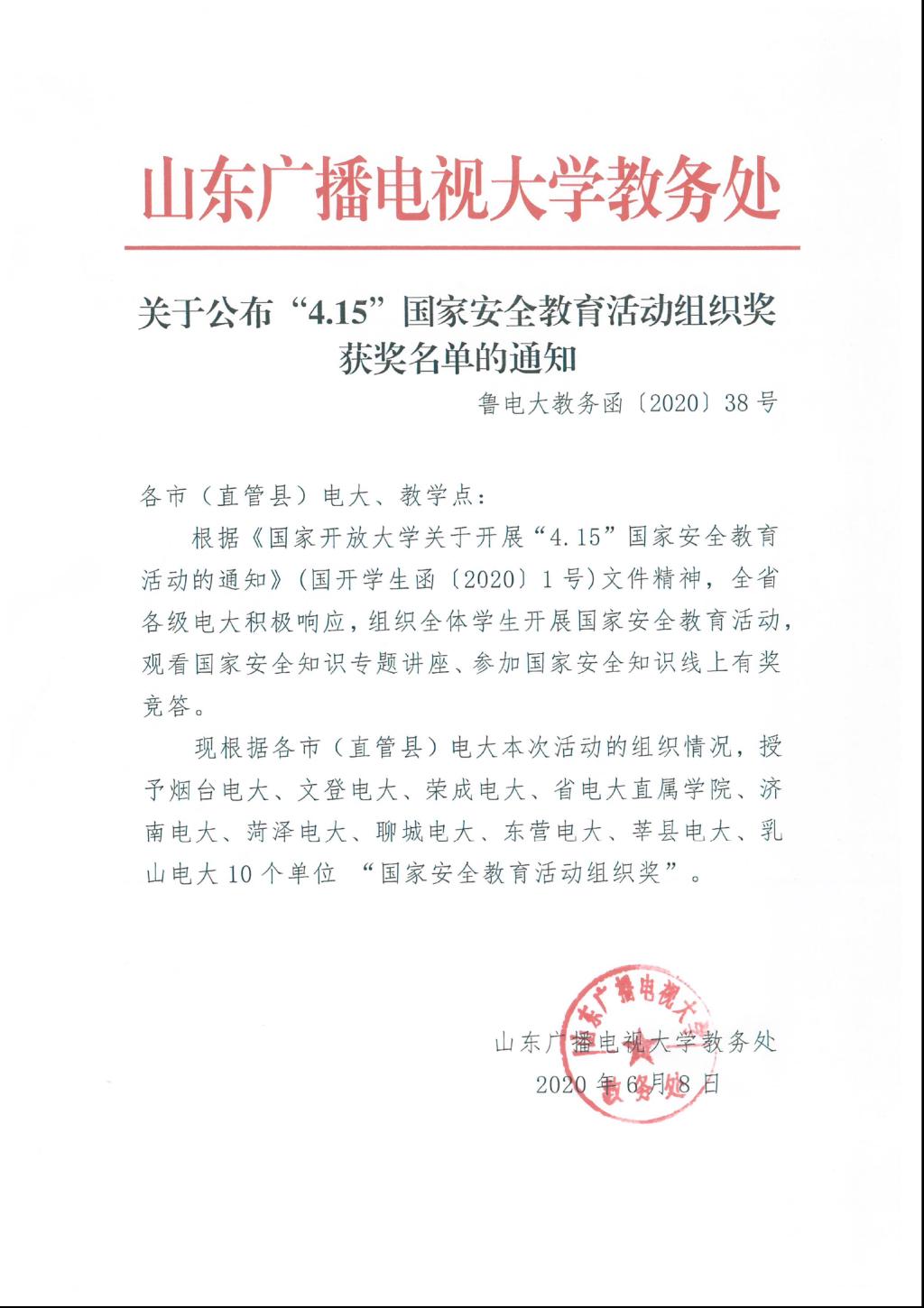 2020年4月15日是我国第五个全民国家安全教育日,国家开放大学面向办学体系全体学生开展国家安全教育活动。聊城电大各教学点组织学习观看国家安全知识专题讲座,进行线上答题,获得“国家安全教育活动组织奖”。