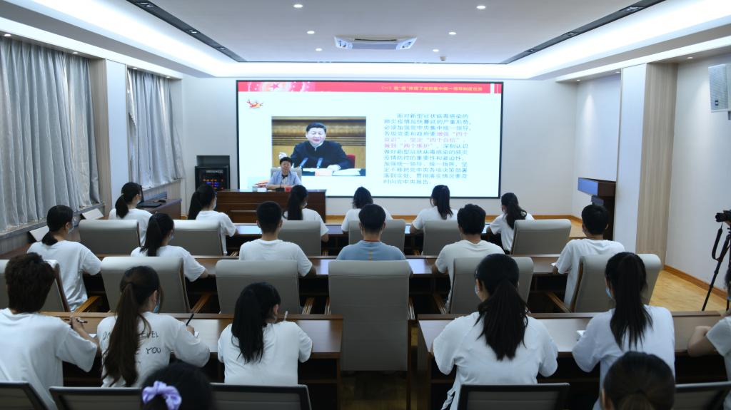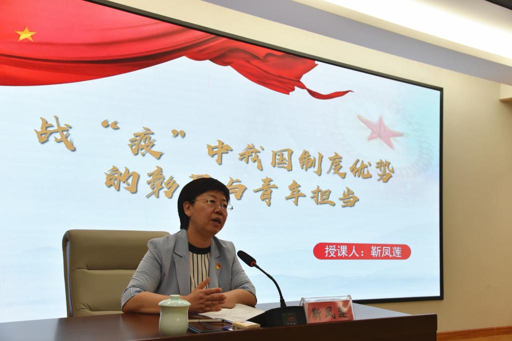 7月2日,党委书记靳凤莲以《战“疫”中我国制度优势的彰显与青年担当》为题,为医学系学生和全体辅导员老师讲授了一堂生动精彩、寓意深刻的“形势与政策”课。