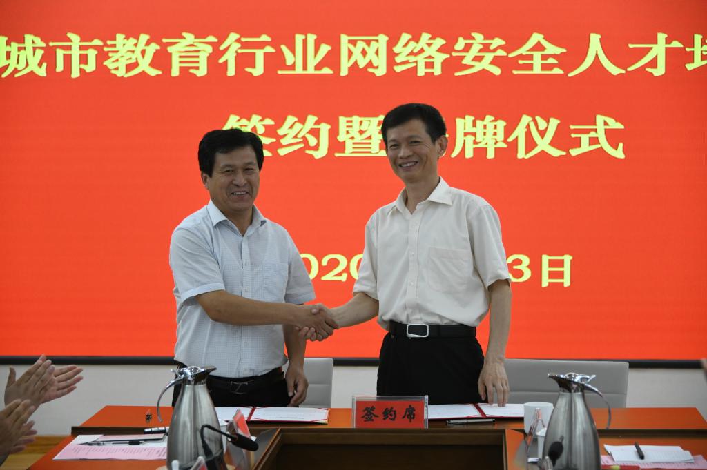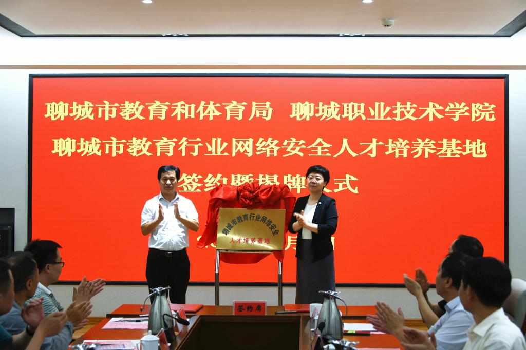 随后,徐龙海和王福祥签署合作协议,靳凤莲和王福祥共同为“聊城市教育行业网络安全人才培养基地”基地揭牌。
