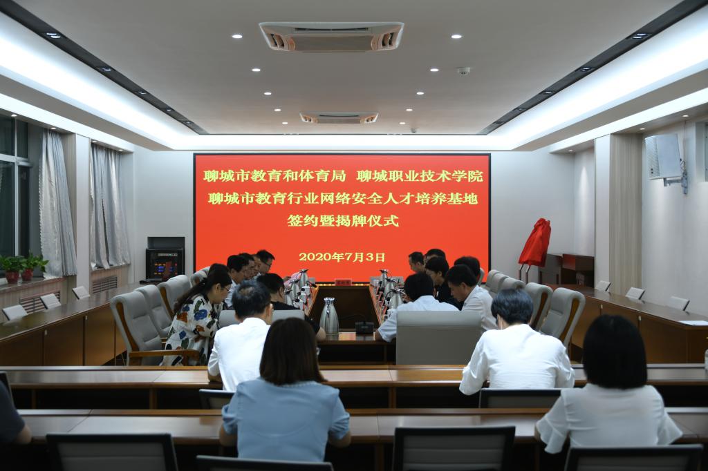 “没有网络安全就没有国家安全”。为共同推进聊城市教育行业网络安全,提升教育行业网络安全人才培养,7月3日,聊城职业技术学院与聊城市教育和体育局举行聊城市教育行业网络安全培养基地签约和揭牌仪式。聊城市教体局党组书记、局长王福祥,四级调研员郭章记,电化教育馆馆长秦雪出席仪式。学校党委书记靳凤莲,党委副书记、院长徐龙海,党委委员、副院长孟凡云,党委委员、合作服务处处长徐洪祥及有关处室系部负责人参加会议。