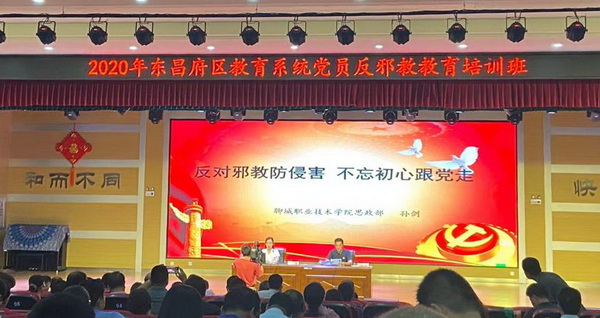 8月8日下午,聊城市东昌府区委政法委举办的区教育系统党员反邪教教育培训班举行。聊城职业技术学院思政部负责人孙剑应邀做主题为《反对邪教侵害 不忘初心跟党走》的培训。该区委政法委副书记、二级调研员谷学鹏主持,并作了开班讲话。全区教育系统党组织书记、党务干部、全体党员共2300余人参加了培训。