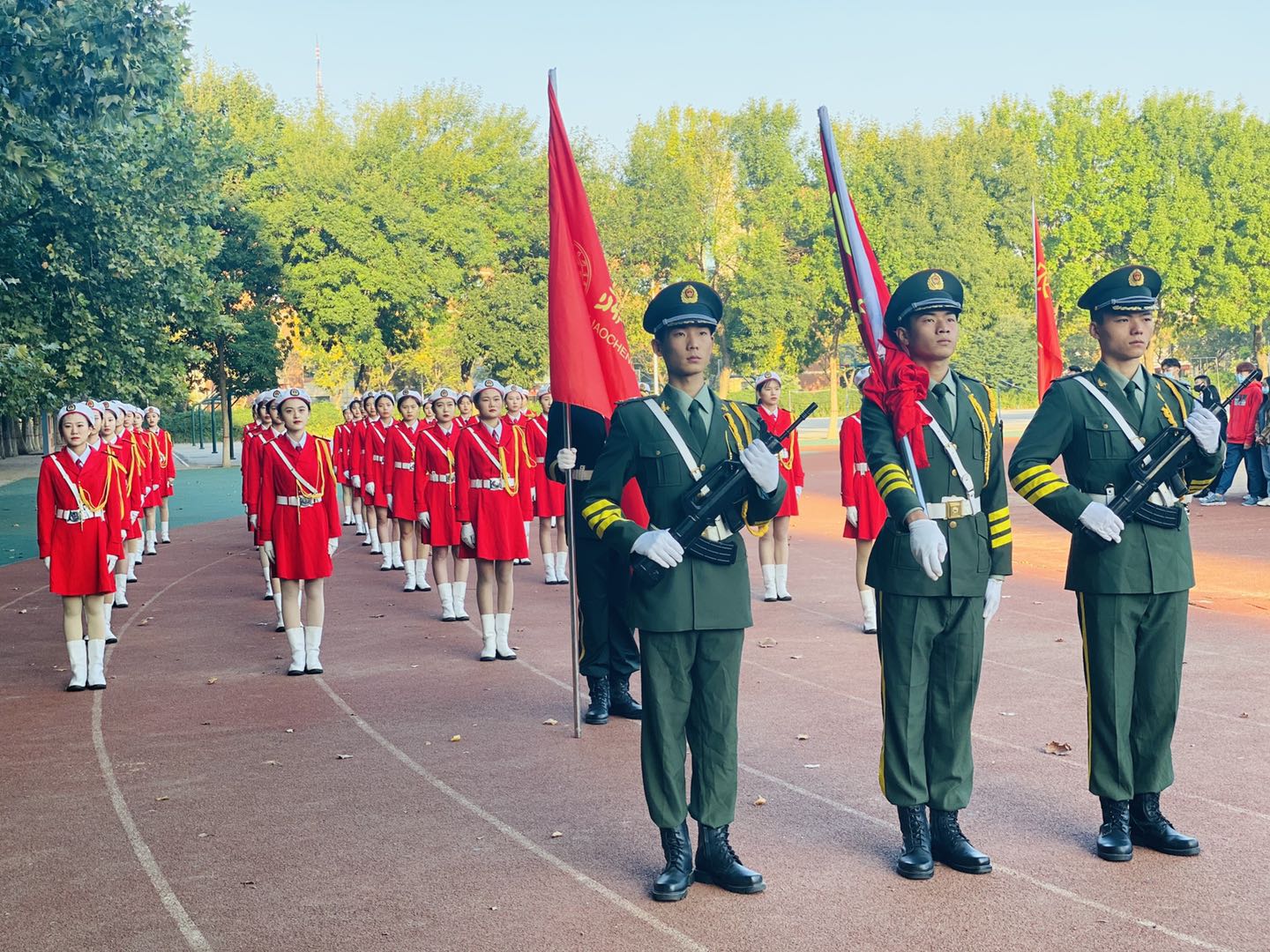 7时整,在庄严的音乐声中,国旗护卫队迈着铿锵有力的步伐,迎着朝阳,护送国旗迎面走来,英姿飒爽的女子仪仗队紧随其后。“升国旗,奏国歌!”随着一声令下,雄壮的《义勇军进行曲》响起,五星红旗冉冉升起,一声敬礼,全体师生肃穆,行注目礼。