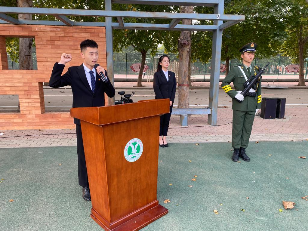 2019级护理系学生会主席刘泽温同学带领同学庄严宣誓:胸怀大志,放飞梦想;诚实守信,礼貌待人;团结同学,尊敬师长;自我管理,主动发展;铭记师长教诲,牢记父母嘱托。用坚韧挑战极限。用信念铸就辉煌。为实现中华民族伟大复兴的“中国梦"而奋斗!