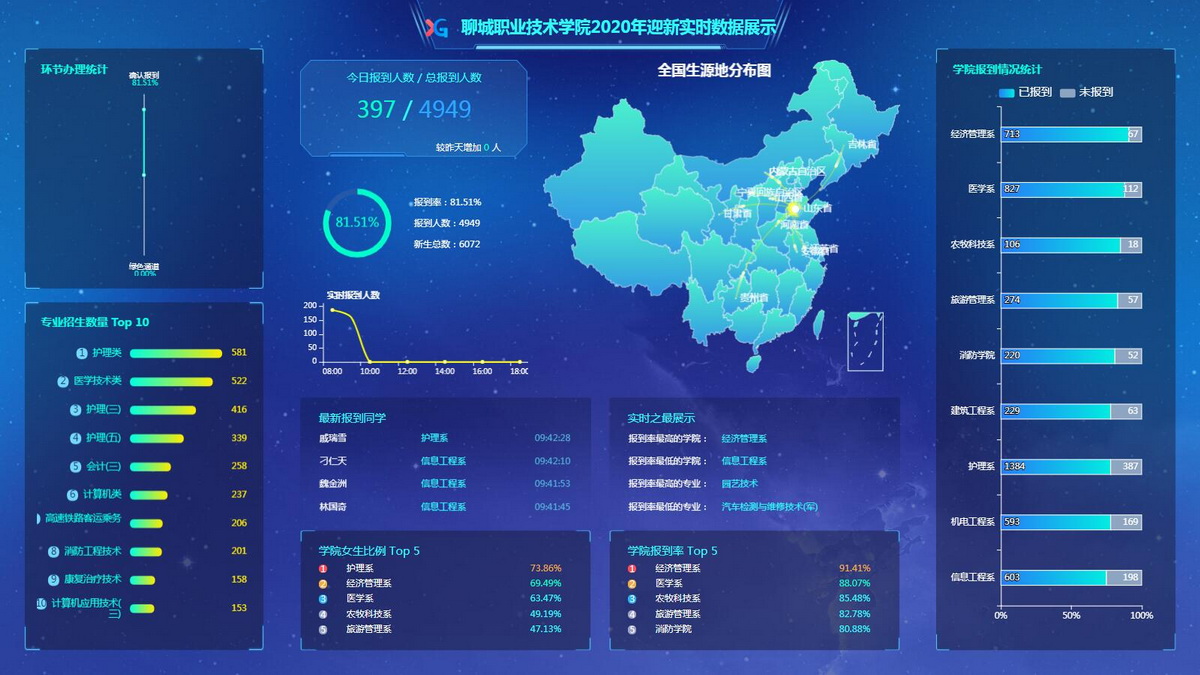 前置化打通“堵”点让迎新工作化整为零。面对迎新工作协调性差、迎新数据不统一、迎新信息不通畅等问题,信息化中心制定学校信息化数据管理办法。根据迎新部门职责和业务分工,进行数据资源的统筹规划、建设,并按要求向共享数据中心提供权威数据,进行数据全生命周期管理。前置化运作,配置完善系部处室信息点和信息源,形成回路,畅通信息流。实现迎新工作的化整为零。