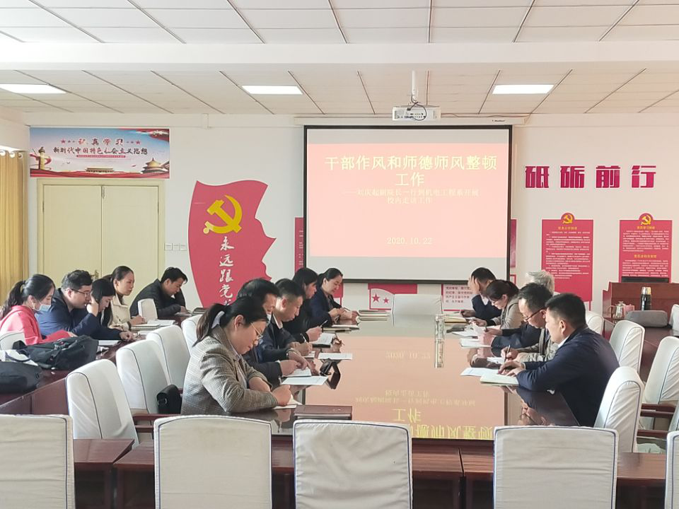 10月22日下午,学院党委委员、副院长刘庆起就干部作风和师德师风整顿工作到机电工程系走访。招生处、后勤处、保卫处等相关处室干部职工参加。校内走访将分两次开展。机电工程系副科以上干部及全体辅导员老师参与本次走访座谈。