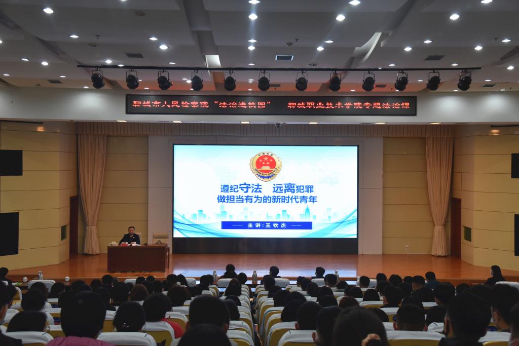 仪式上,徐龙海向王钦杰检察长颁发了“聊城职业技术学院法治客座教授”聘书。随后,王钦杰以“遵纪守法 远离犯罪 做担当有为的新时代青年”为主题,结合大学生的年龄特点,通过工作实践真实案例,以案释法,以法论事,深入浅出地为学校师生作了一场精彩生动的报告,希望广大学生在日常的学习和生活中要自觉遵守法律法规,做一名合格的大学生,做知法、守法、学法、用法的新时代青年。