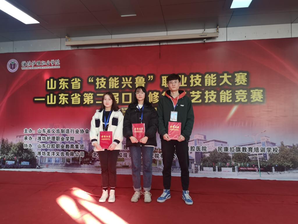 本次大赛由山东省人力资源和社会保障厅指导、山东省义齿制造行业协会主办,潍坊护理职业学院承办,全省开设口腔医学技术专业的10所院校12支队伍36名选手参加了本次比赛。比赛项目包括牙体雕刻、全口义齿排牙和CAD设计三项。我校派出3名选手分别参加了本次比赛三个项目。经过激烈角逐,我校2018级口腔医学技术专业鲁春苗同学以第一名的成绩荣获CAD设计项目一等奖、海岩同学以第二名的成绩荣获牙体雕刻项目二等奖、潘沛荣同学以第二名的成绩荣获全口义齿排牙项目二等奖,我校以团体第一名的成绩荣获团体一等奖和优秀组织奖,李鹏、冯桂芝、谢丽娜三位老师荣获优秀指导教师奖。