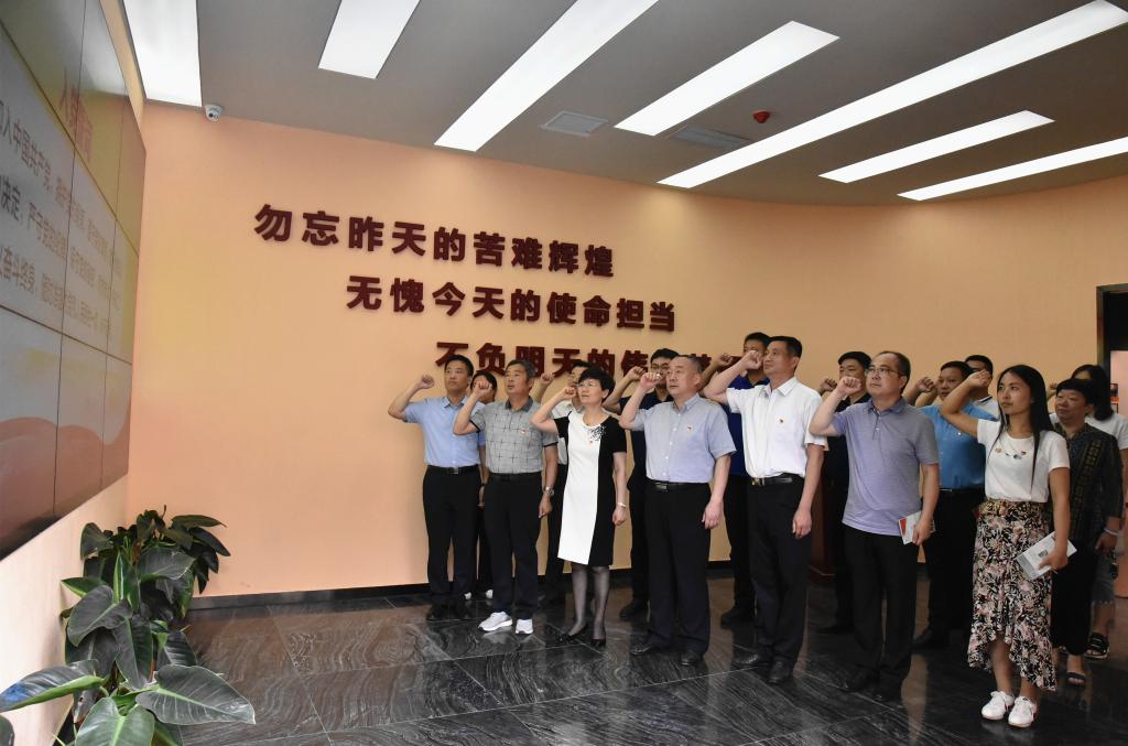 在鲁西“四史”主题教育馆尾厅,大家面对鲜红的党旗,重温了入党誓词。