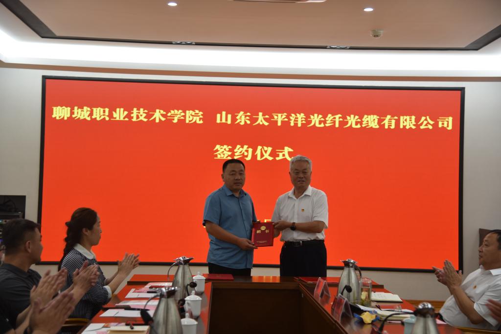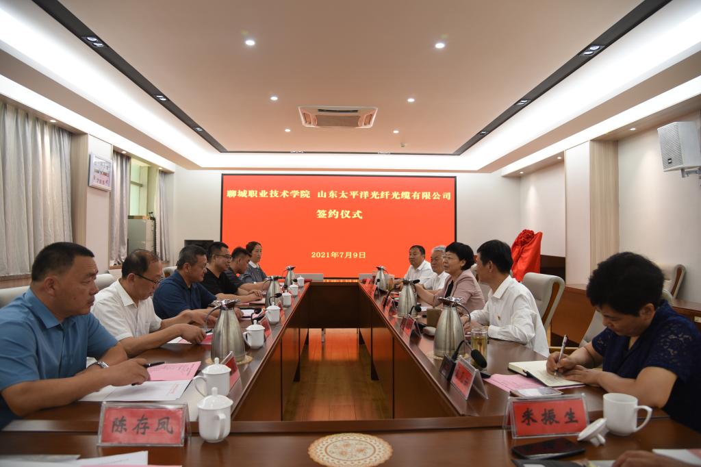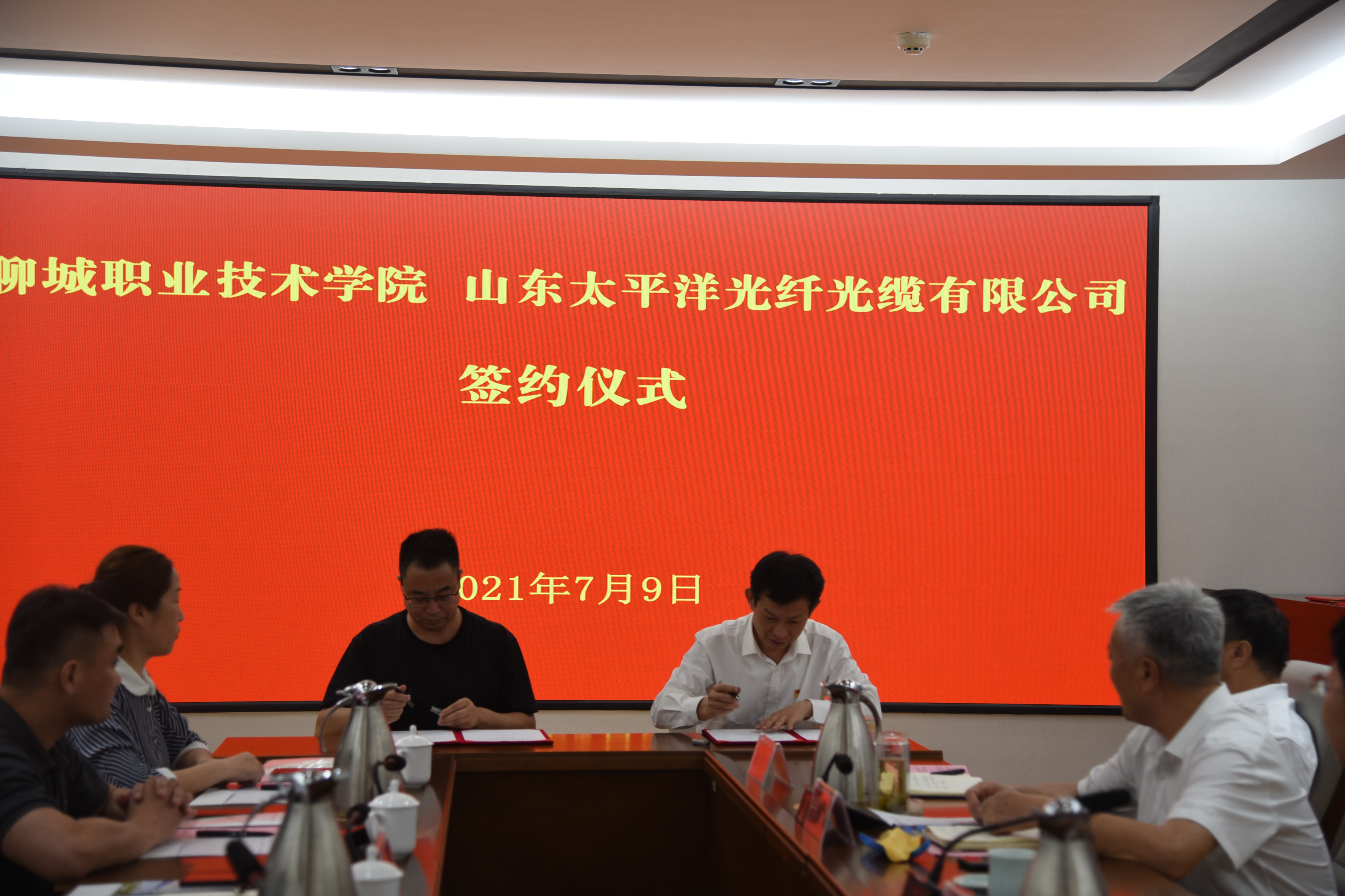 7月9日上午,聊城职业技术学院与山东太平洋光纤光缆有限公司举行校企合作签约仪式。聊城职业技术学院党委书记靳凤莲,党委副书记、院长徐龙海,党委委员、副院长刘庆起、副院长孟凡云,党委委员、合作服务处处长徐洪,党委委员、组织人事处处长米振生,山东太平洋光纤光缆公司董事长高宪武、总经理周文、研发总监李广省、生产总监高海涛、设备经理孟昭立、综合管理部经理张淑杰、总裁办主任陈存凤等人出席会议。靳凤莲主持签约仪式。