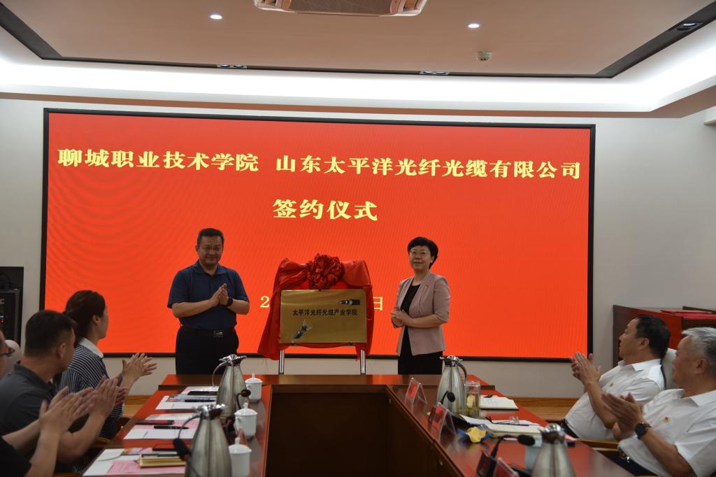 徐龙海、周文代表双方签署合作协议;靳凤莲、高宪武为“太平洋光纤光缆产业学院”揭牌。