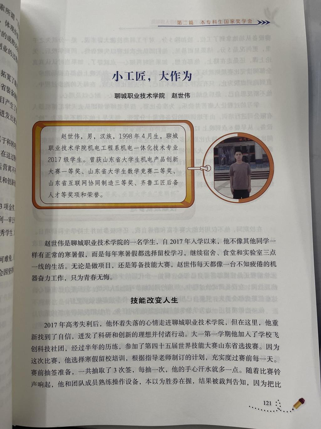 近日,我院选送的国家奖学金优秀学生案例《小工匠,大作为(聊城职业技术学院 赵世伟)》入选“向建党百年献礼《扶贫扶志 助学铸人——山东省学生资助育人成果集》”。