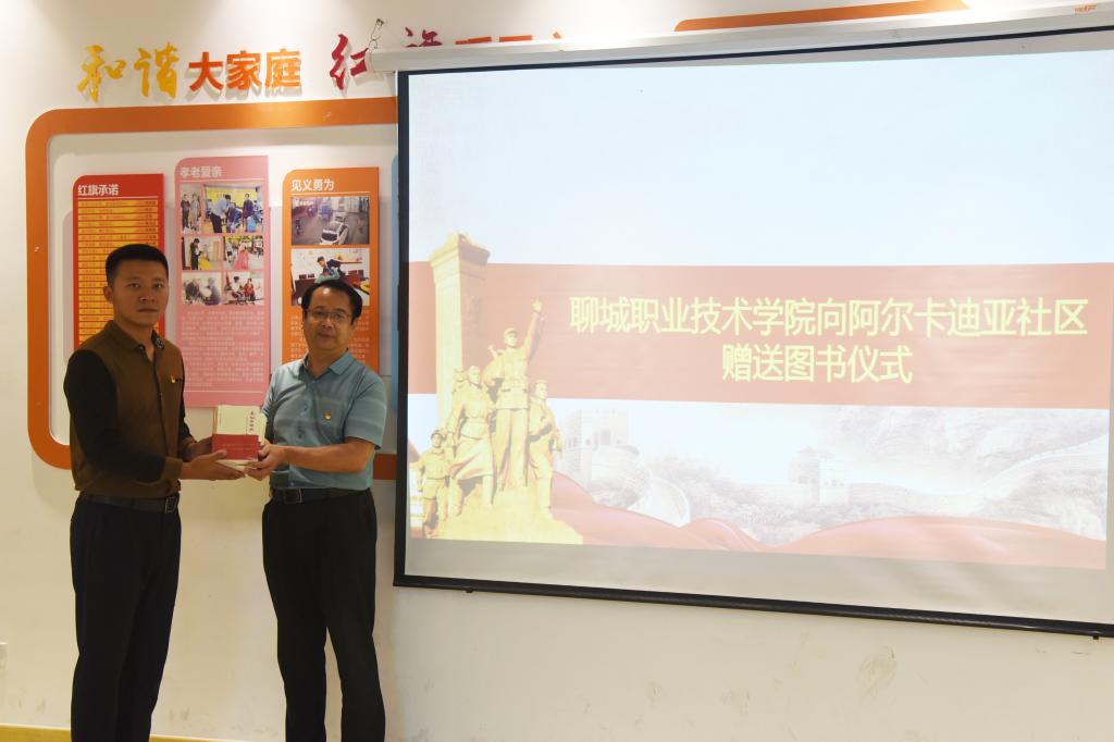 9月18日下午,聊城职业技术学院向阿尔卡迪亚社区赠送红色图书。学院宣传部崔爱民、李瑞,思政部教师孙玉荣,阿尔卡迪亚社区党委书记何庆辉及辖区内的党员近30人参加活动。