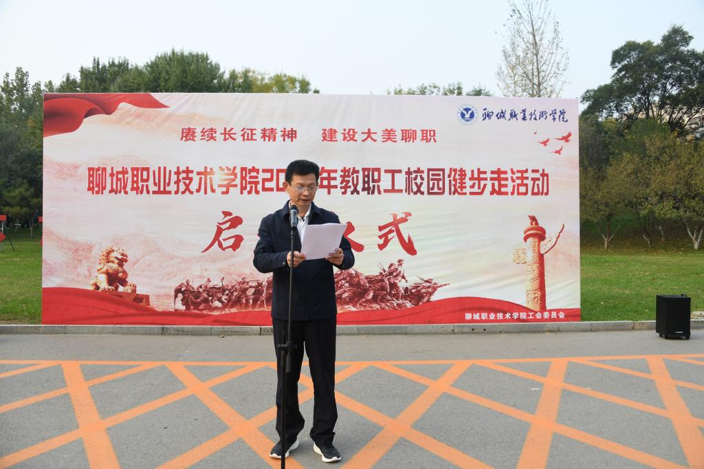 徐龙海在启动仪式上致辞。他指出,今年是建党百年华诞,是红军长征胜利85周年,也是学校“十四五”规划开局之年。要深入贯彻落实习近平总书记关于不忘党的初心和使命、弘扬伟大长征精神的号召和嘱托,推动全民健身运动开展,全面提升教职工身体素质。重走“长征路”,让大家更加深刻感悟党的百年奋斗历程,更加真切感受共产党人对信仰的忠诚、对信念的执着、对初心的坚守。同时,也让大家在繁忙的工作之余,更多地走向户外,走向健康。以此次活动为契机,以革命先辈为榜样,勇担使命、主动作为,立足岗位发扬伟大长征精神,锐意进取、开拓创新,为“奋战十四五,建设新聊职”作出新的更大贡献!