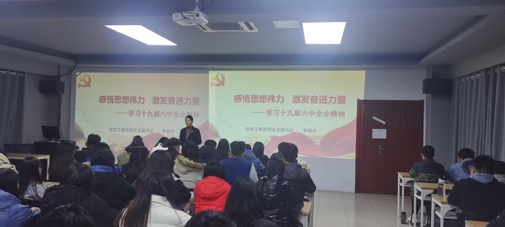 为全面深入学习贯彻党的十九届六中全会精神,提升学生干部和入党积极分子的政治素养、政治觉悟。12月12日,信息工程系党总支副书记李晓平以《感悟思想伟力 激发奋进力量》为题,为近百名学生干部和入党积极分子宣讲全会精神。