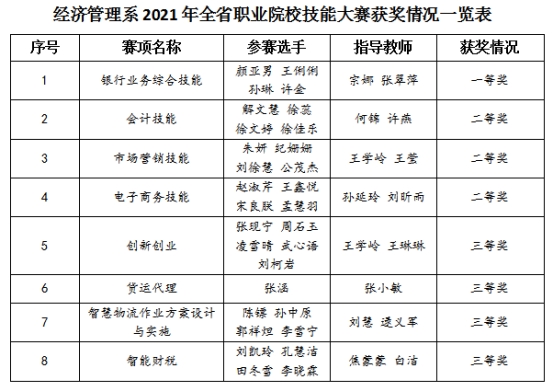 在2021年11月至12月举办的全省职业院校技能大赛中,经济管理系参加的8个财经商贸类赛项全部获奖,其中获得一等奖1项,二等奖3三项,三等奖4项。