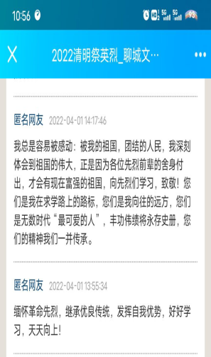 云端深切缅怀。一是组织全系学子利用聊城文明网“网上祭英烈”互动平台,为英烈献花留言,表达对英烈的感恩和敬仰;二是组织学生开展对孔繁森同志的线上祭奠活动,学习繁森精神,争做新时代学繁森好青年;三是组织学生通过学院“青春聊职”公众号参加“清明祭英烈”网上祭扫活动,学习刘胡兰、赵一曼等革命烈士的英雄事迹,传承民族精神。