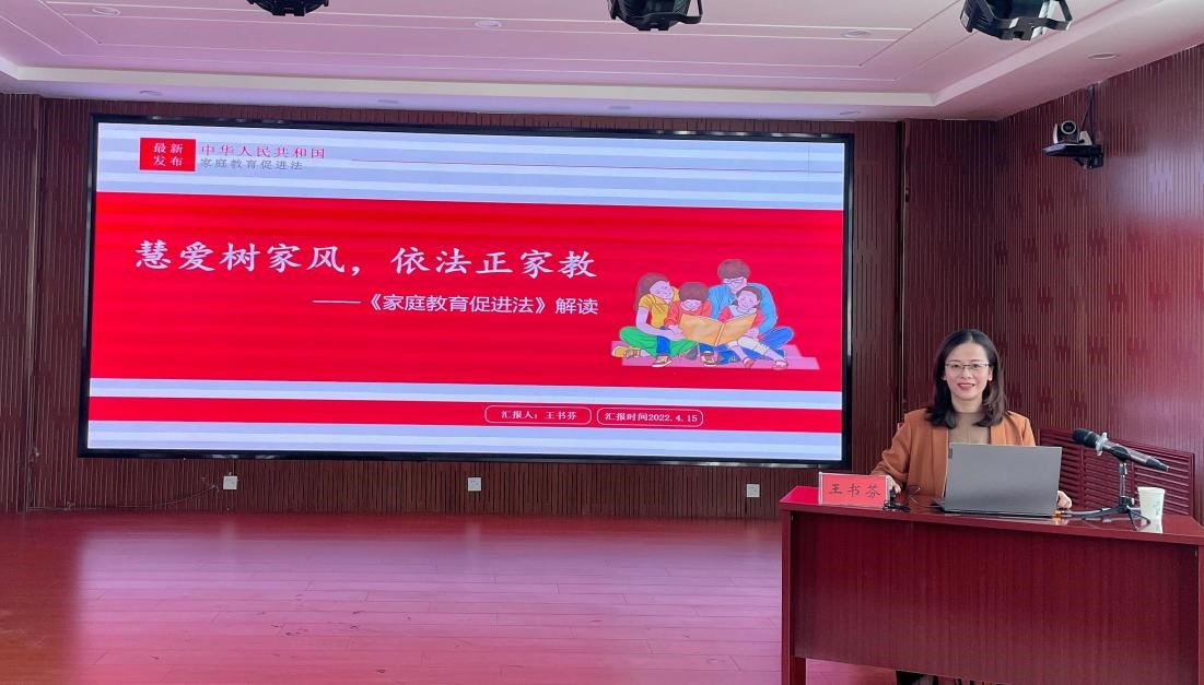 我院家风文化研究院接到市妇联的邀请,积极准备,把该项工作作为家风研究院服务社会的契机。本次培训由大学语文教研室主任王书芬主讲。报告从《家庭教育促进法》的出台背景、基本内容、亮点解读和落地践行四个部分进行解读,整个讲解结合生动的案例,分析了家庭教育的重要性,家庭教育的内容,以及家庭教育的方法途径,受到参训职工的好评。