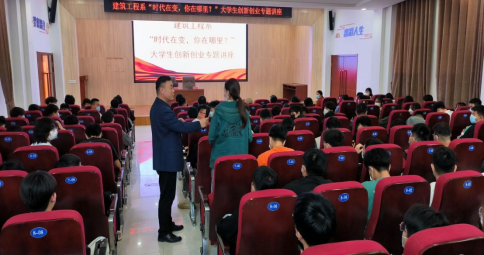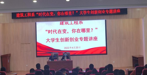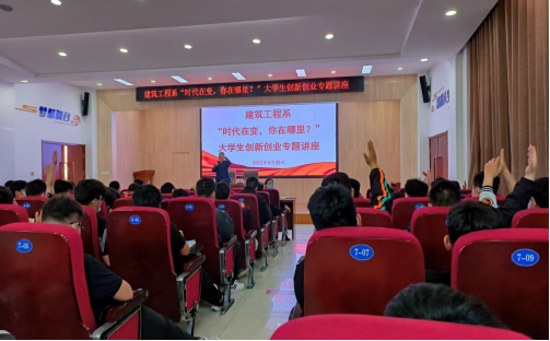 为培养大学生创新精神和创新创业实践能力,近日,建筑工程系举办“时代在变,你在哪里”为主题的创新创业专题讲座,学工部副部长王增朝受邀为我系100余名学子分享人生“秘籍”,党总支副书记邵琰主持讲座。