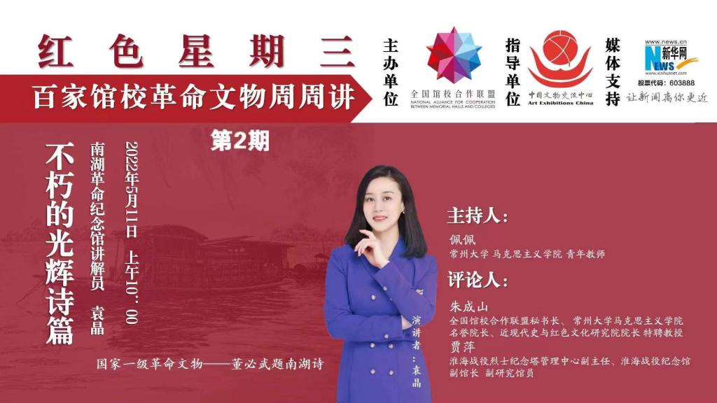 本期主持人是常州大学教师汪佩。主讲人由南湖革命纪念馆副研究馆员袁晶担任,她以《不朽的光辉诗篇》为题,围绕着国家一级革命文物——董必武题南湖诗,讲述了嘉兴南湖游船上发生的革命故事以及伟大的红船精神。她的讲述内容新颖、情节生动、脉络清晰、结构紧凑、理事圆融、引人深思。