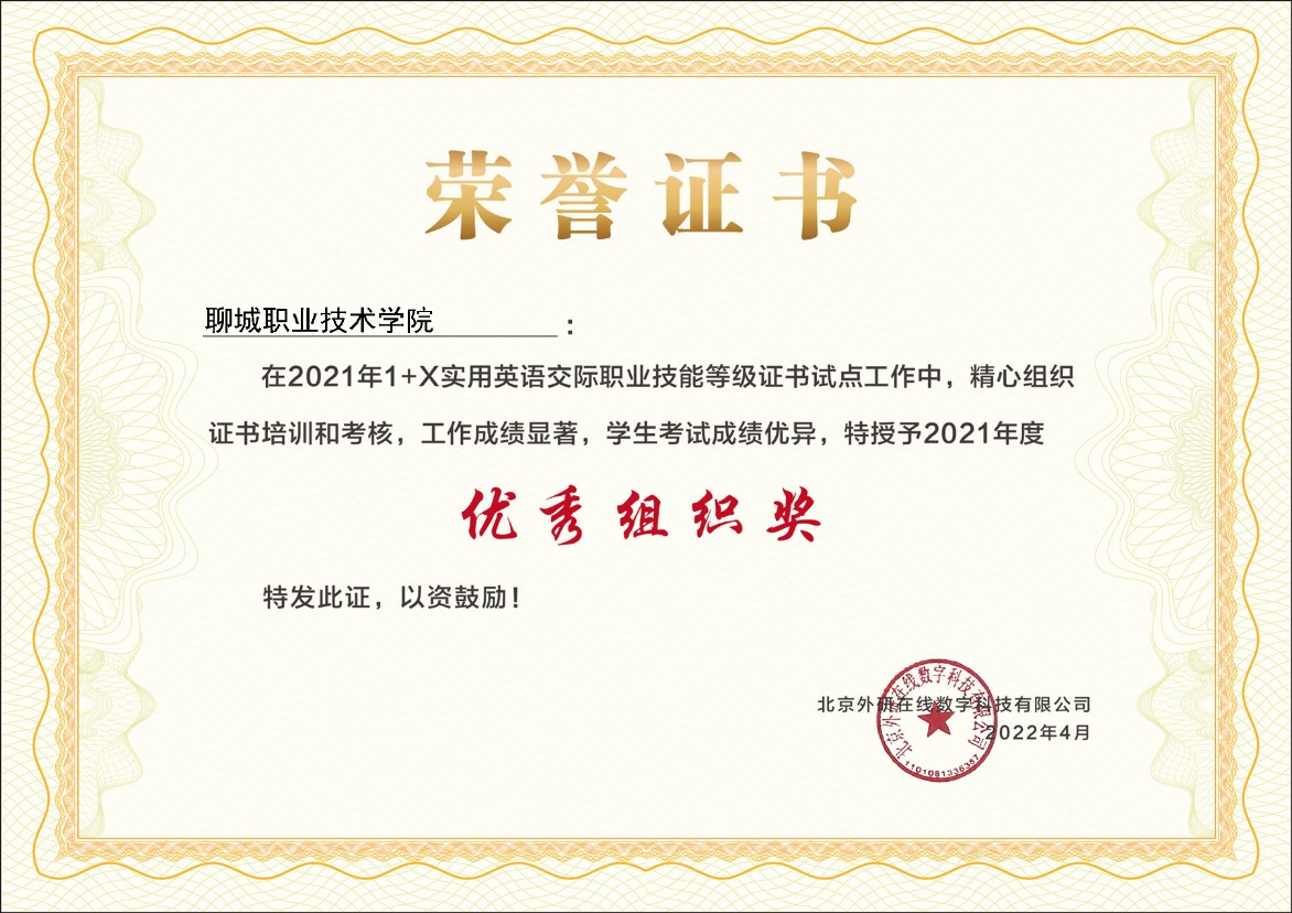 5月14日,山东省高等职业院校外语改革与发展研讨会传来佳讯,我校作为全国首批试点院校,荣获首届实用英语交际职业技能等级证书工作优秀组织奖。1+X实用英语交际职业技能等级证书(Vocational English Test System,简称VETS)全国首考于2021年11月在27个省市自治区,96个城市,194所院校同时举行。VET是教育部1+X证书考试中唯一的外语类考试,考试设定为技术技能人才常见的真实职业场景,融合语言能力与职业能力,要求考生完成真实工作任务,培养考生面向实践,运用所学技能和知识,完成职业场景下使用英语完成任务的综合能力,为未来走上职场、发挥职业潜能夯实基础。