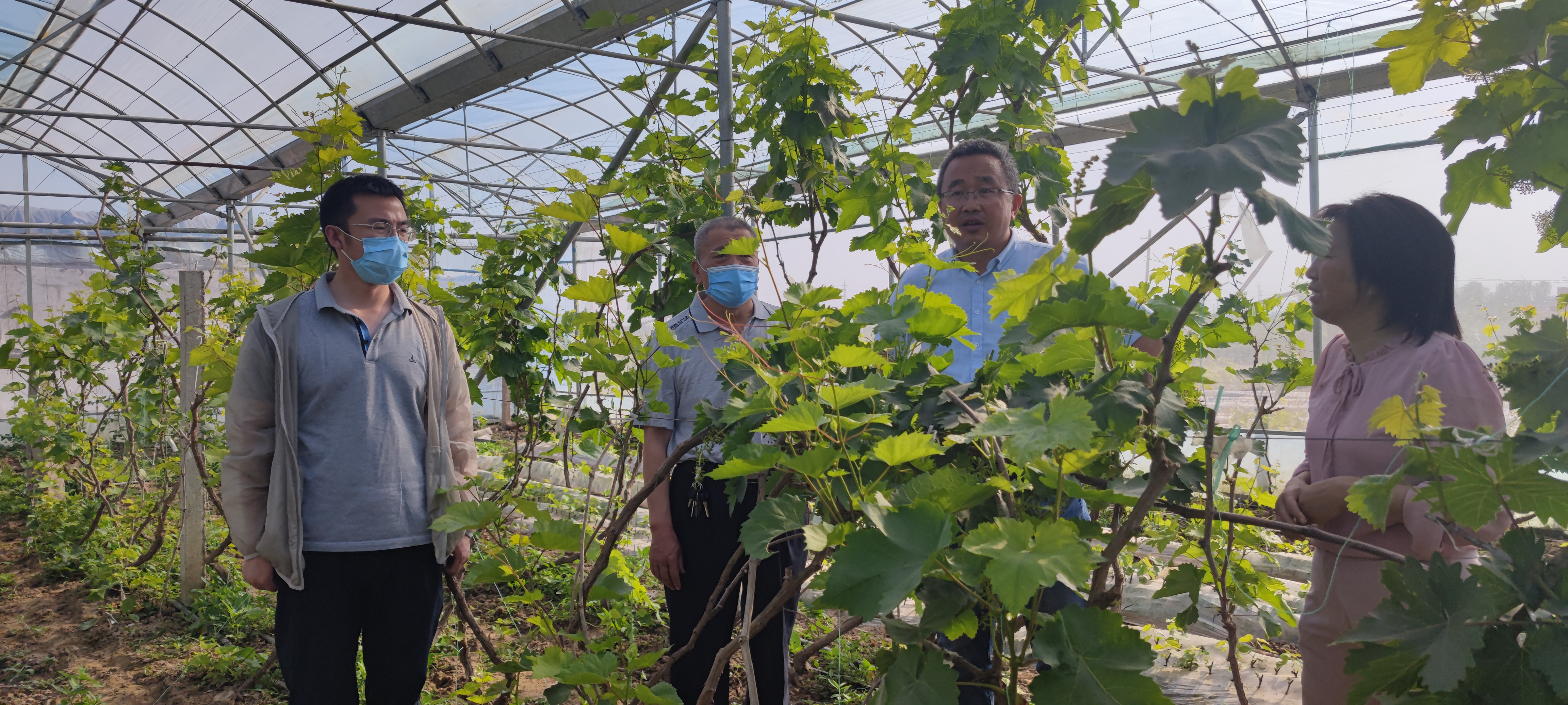 在田野葡萄专业合作社,服务团专家与合作社负责人深入交流种苗培育与新品种开发,现场对葡萄栽培技术及病虫害防治等重点工作进行了指导。与个体葡萄种植农户就葡萄种植经验以及如何提高葡萄产量、品质保障等进行座谈。