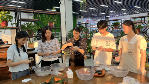 师生互动包粽子。在教师指导下,学生们认真地学习包粽子的手法,折叶、盛料、压实、裹叶、扎绳……。现场气氛热烈,师生积极参与,共同感受端午节的民俗文化。