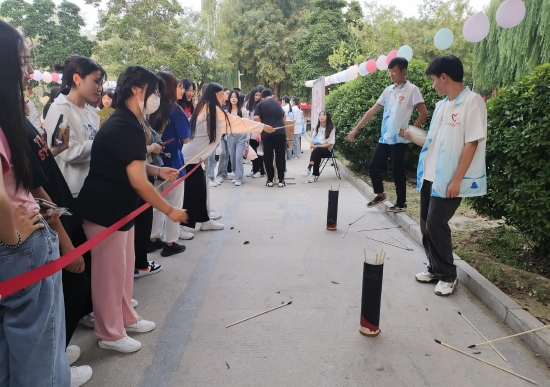 师生同乐,欢度双节。中秋节下午,护理系还在教学楼前举办了“师生同乐,欢度双节”中秋游园会。诗词接龙、投壶、手脚并用、你比我猜、抢凳子、憋笑挑战等活动轮番上阵,掀起了欢度中秋的高潮。成功闯关者可获得一枚印章,集齐6枚印章者就可以参与创意DIY的制作。最后,同学们将自己DIY的团扇、花灯进行集中展示。师生共同度过了一个别样的中秋节。