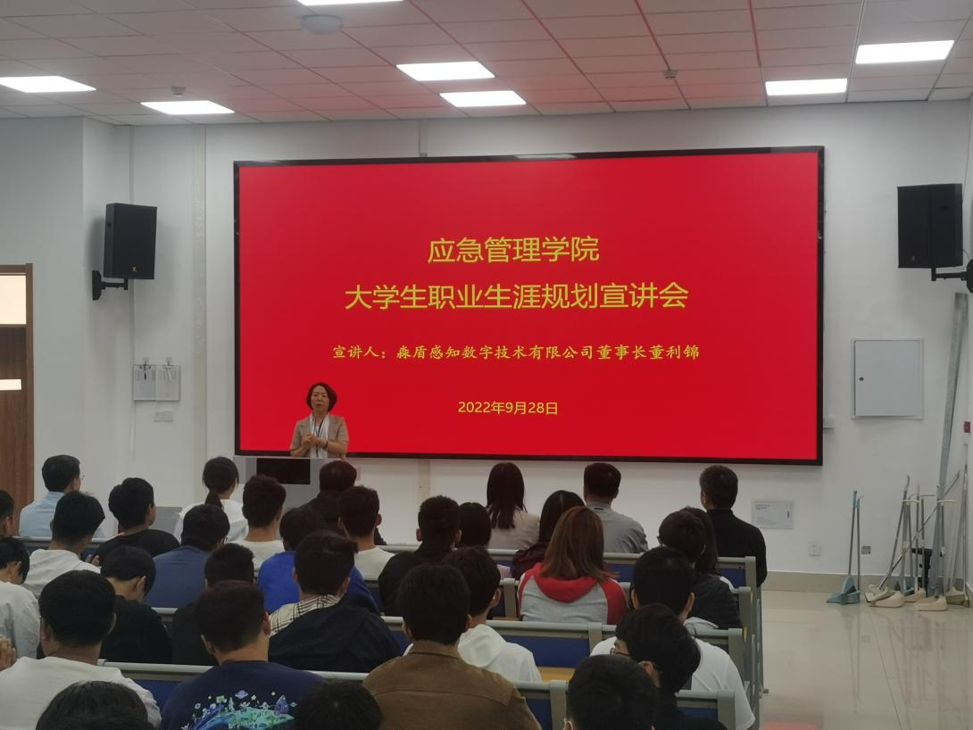 为了增强大学生职业生涯规划意识与能力,不断加强学生职业生涯规划和职业指导服务体系建设,使同学们明确远大的职业理想,更好地规划职业生涯,9月28日上午,应急管理学院在信息楼东阶梯举办了大学生职业生涯规划宣讲会,淼盾感知数字技术有限公司董事长董利锦应邀来校为学生作报告,应急管理学院全体教师和大一大二学生参加活动。宣讲会由应急管理学院院长郭玉娟主持。