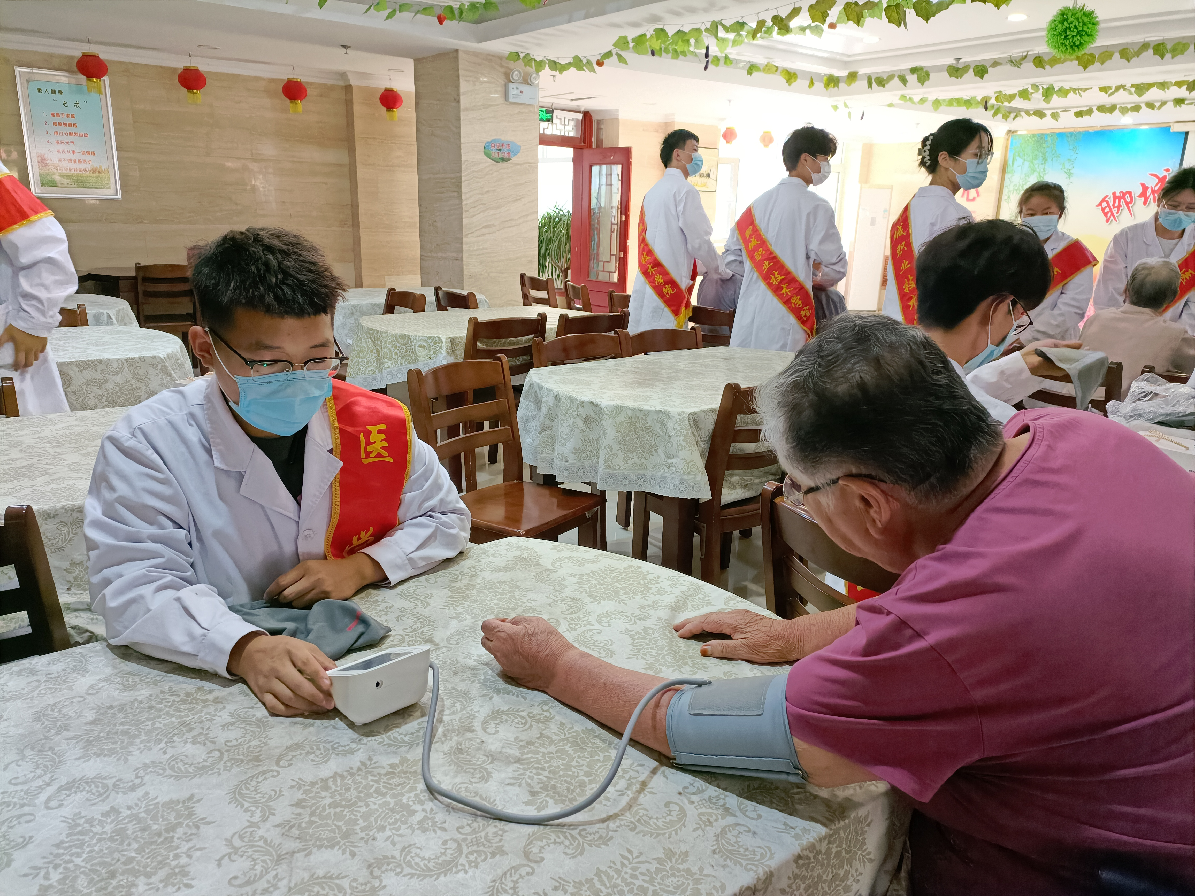 活动现场,党员教师与青年志愿者们结合专业知识,开展血压检测、康复保健等服务;耐心生动的向老人们普及科学防病、安全用药、口腔护理等知识;与老人们分享现在的生活,谈谈今后的期望,让老人们感受到浓浓的温暖。