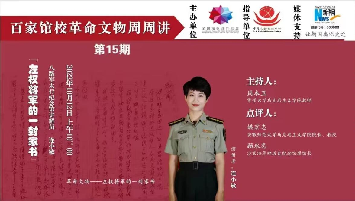 本期的主持人是常州大学马克思主义学院教师周本卫。主讲人由八路军太行纪念馆讲解员连小敏担任。她以《左权将军的一封家书》为题,围绕国家重要革命文物——左权将军的家书,讲述了在风雨如磐的战争年代所发生的动人故事。家书表达的不仅仅是革命者的儿女情长,更多的是他们浓厚的家国情怀。