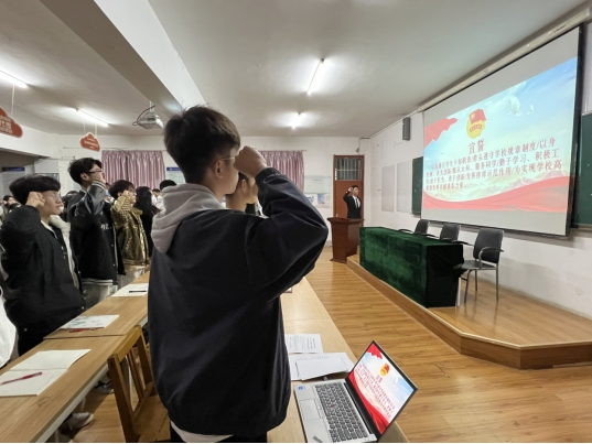 会议上,郭怡老师宣读各学生组织同学名单。学生会主席李嘉炜、系团务中心主任张紫月、青年志愿者协会主席李国新、社团管理部部长张成姝进行了工作述职,述职结束后,在学生会主席李嘉炜的带领下,全体同学本着“全心全意为同学服务的宗旨”进行庄严宣誓。
