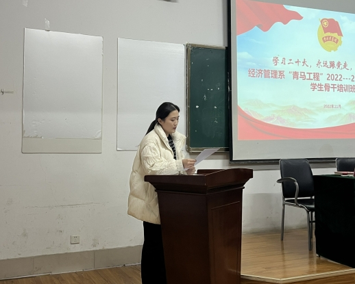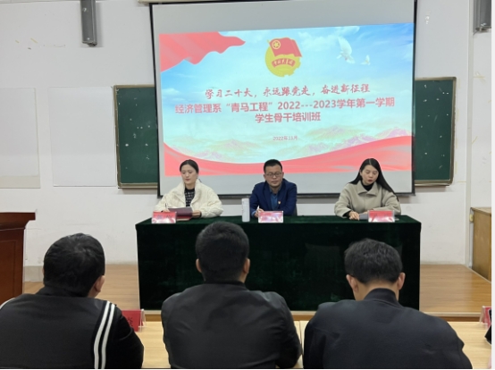 为深入学习贯彻习近平新时代中国特色社会主义思想,贯彻落实党的二十大精神,进一步探索新时期学生工作思路和方法,提高学生骨干队伍的整体素质和业务水平,11月9日,经济管理系举行“青马工程”2022-2023学年第一学期学生骨干培训班。经济管理系党总支副书记崔兴军、团总支书记奚源、团总支辅导员老师及学生干部代表、优秀团员代表共同参加了本次活动。