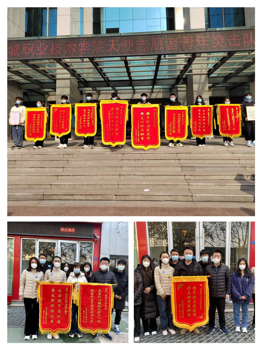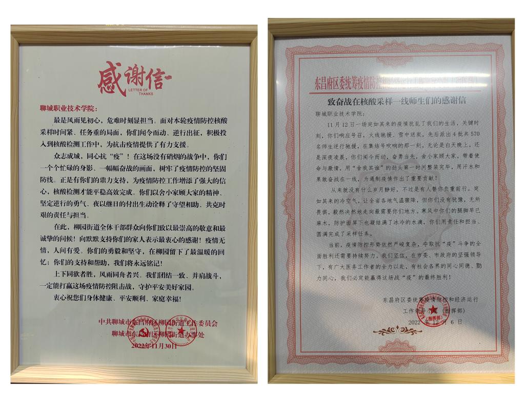 在增援核酸采样工作期间,师生们不畏艰险、坚守岗位,科学、高效、细致、安全地完成上级布置的各项任务,获得了各增援点党委、政府和居民的一致好评,并收到了来自东昌府区区委统筹疫情防控和经济运行工作领导小组指挥部、柳园街道工委的感谢信和多个社区送来的锦旗。