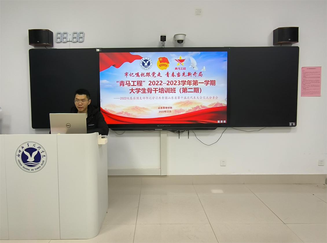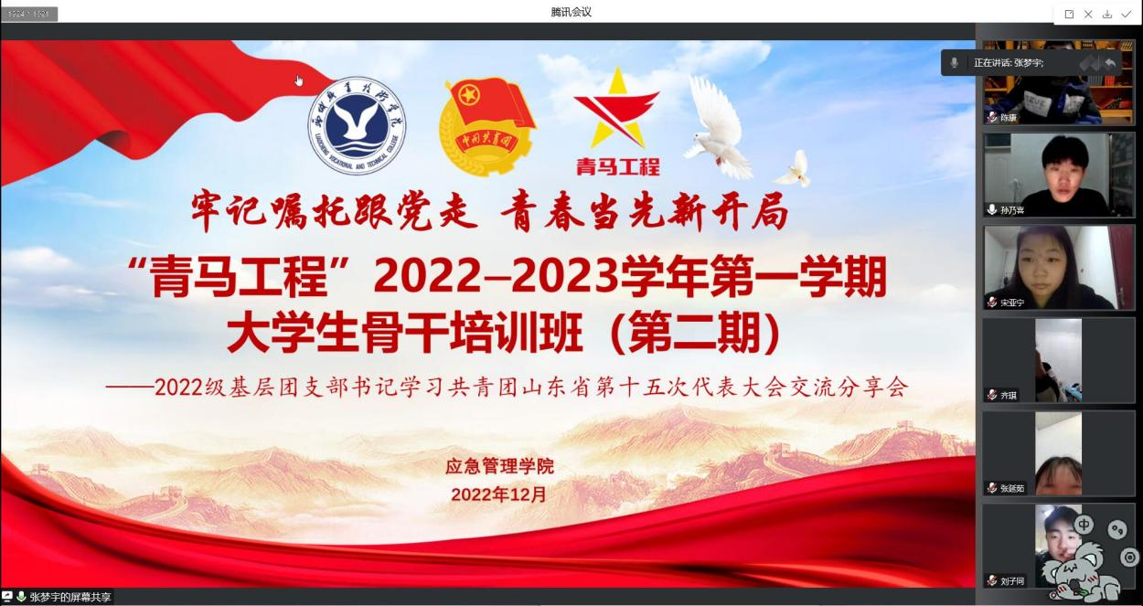 12月21日,应急管理学院举办“青马工程”第二期大学生骨干培训班,以线上学习的方式开展了共青团山东省第十五次代表大会交流分享会。辅导员陈振宇围绕领导讲话和团代会报告做了专题分享,学院团务中心以及学生会主要学生干部共30人参加了集中学习,并就大会报告展开了热烈讨论。