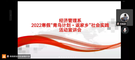 为深入宣传贯彻团省委关于“青鸟计划·返家乡”社会实践活动的部署要求,深化大学生寒假返家乡实践活动,1月6日,经济管理系召开2022寒假“青鸟计划·返家乡”社会实践活动启动大会和宣讲会。经济管理系党总支副书记崔兴军、团总支书记奚源、全体辅导员老师、优秀学生代表、学生会干部以及各班班长参加活动。