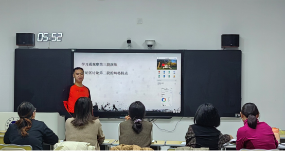 李桂敏等四位老师分别就《Keep a Balance Between Work and Study》《精益求精的工匠精神》《感受中国速度,增强爱国主义情感》《太极扇:立身中正》4个题目进行课程思政教学设计现场展示。孔祥云及各教研室主任对教学展示逐一进行点评,并从各课程与专业的结合点、教法适用性、课堂的师生互动、信息化手段应用、知识传授与课程思政目标的实现以及板书设计等多个方面对课程进行指导提升。