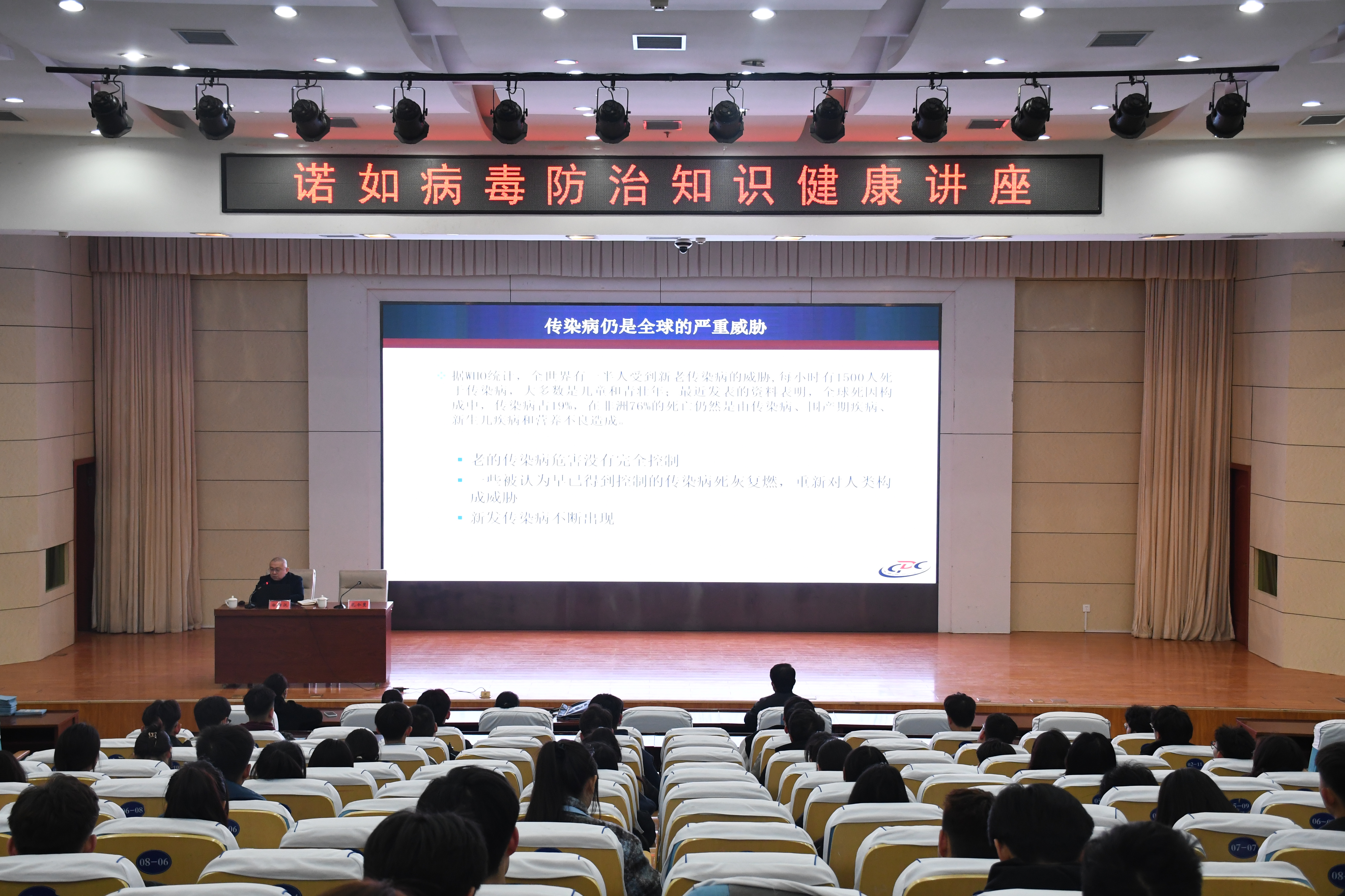 白新汉针对诺如病毒的致病特点、临床表现、预防措施等做了详细讲述。他指出,诺如病毒是一种在冬春季节广泛流行的病毒,具有发病急、传播速度快、涉及范围广等特点,感染主要通过肠道进行传播,常见症状是呕吐、腹泻,部分患者会有发烧和乏力表现。预防措施主要是养成良好的卫生习惯,勤洗手、不喝生水、生熟食物要分开,避免交叉感染。全场同学聚精会神,仔细聆听。报告深入浅出,生动形象,博得了广大师生的阵阵掌声。