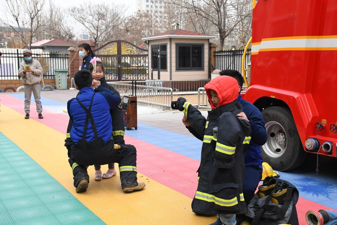 在活动体验中,消防队员介绍防火服、灭火器等知识,现场邀请老师、小朋友体验如何使用这些消防器材,组织老师和小朋友们模拟火灾发生时该如何逃生及疏散,并进行现场演练。