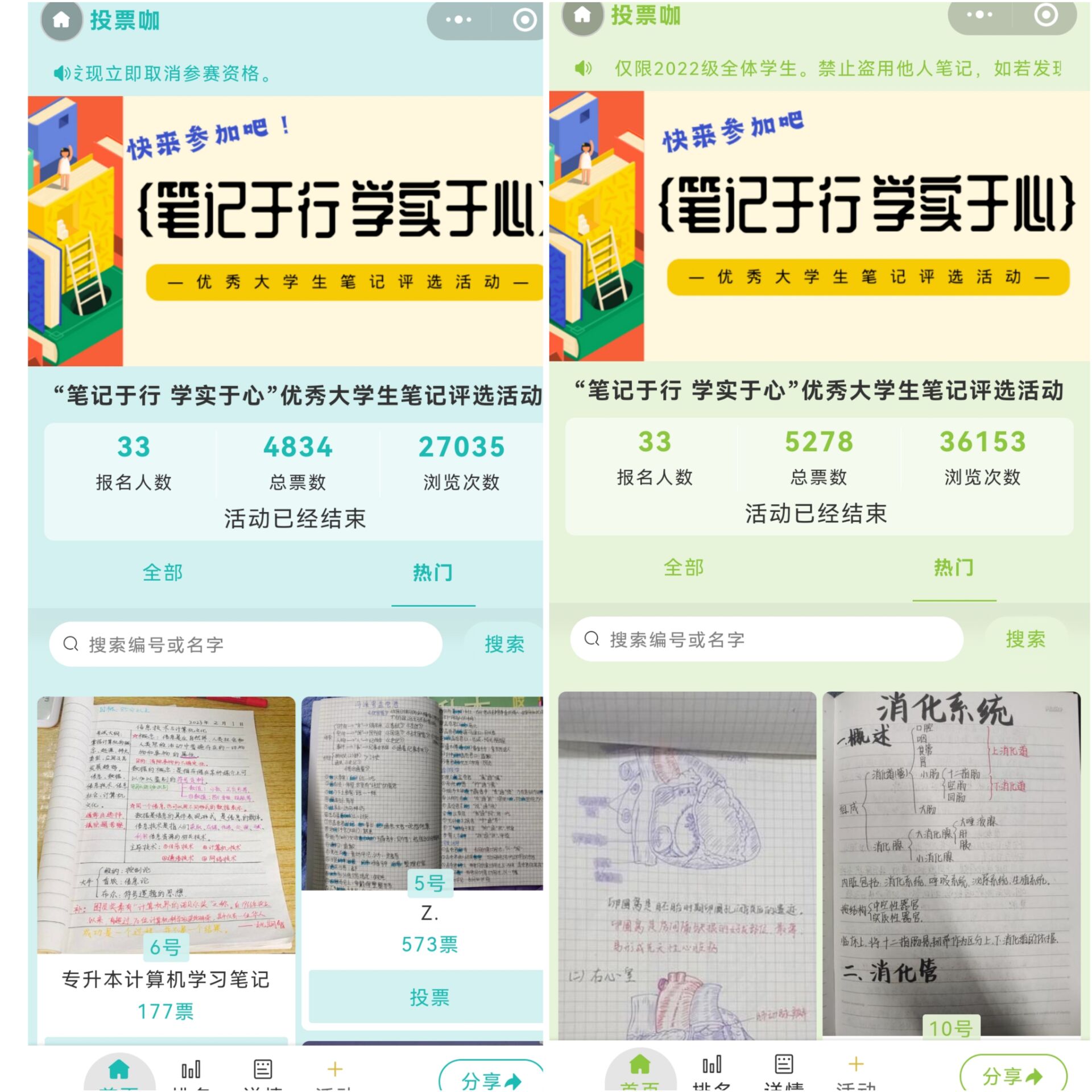 活动利用微信小程序平台,开通了线上赛道,由学生根据年级自主上传学习笔记,再经由微信小程序进行投票。活动获得学生们的积极响应,踊跃参与,线上线下共报送笔记124本。线上投票通道总票数达10000多票,浏览次数达63000余人。