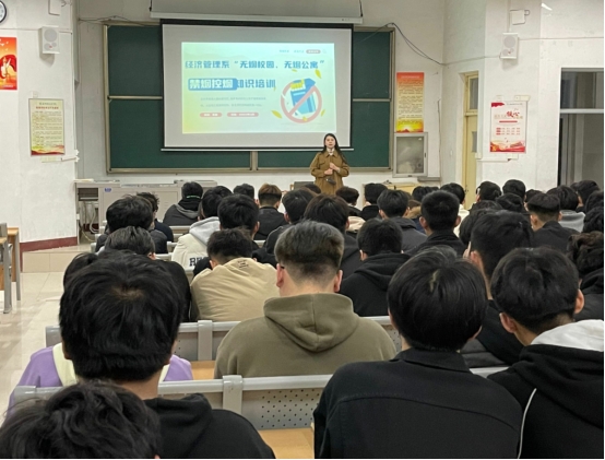 为积极建设无烟校园,营造文明、和谐的校园环境,确保师生身心健康,3月21日至23日,经济管理系开展两次“无烟校园 无烟公寓”禁烟控烟知识培训。经济管理系党总支副书记崔兴军、团总支书记奚源、辅导员及全体在校男生参加培训。